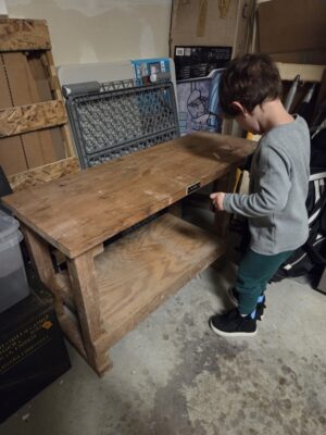 About 35 years ago I made a pair of half-scale but honest to goodness workbenches for my girls. To that end I recently took Mama’s workbench to live in Dada’s little workshop in the garage for Li’l T amd Mighty M to sue to their hearts content.