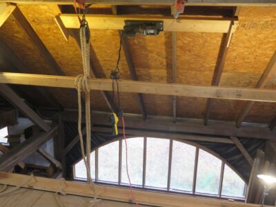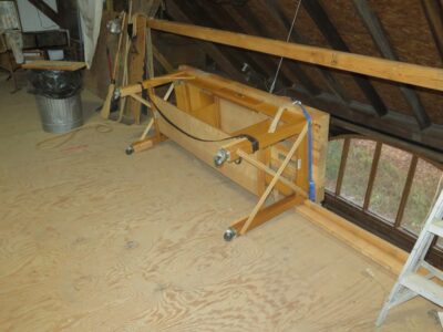 Since finishing the fourth floor of the barn fifteen years ago I’ve used that space for a lot of things; a meeting /presentation space for Groopshop, a video studio, a classroom, a Gragg chair workshop. With the demise of my teaching schedule here the function of the space has (d)evolved into primarily storage especially for extra workbenches and such. Over the years I’ve probably moved benches from the main floor to the fourth floor (and back) a dozen times or more, using my compound block-and-tackle hand hoist.
