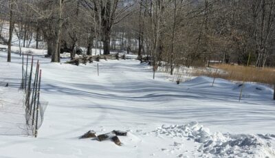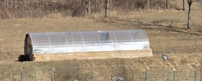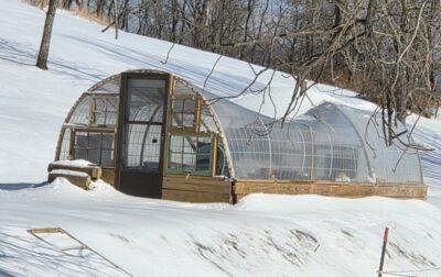 When I built the greenhouse last year I was determined to overbuild it. As the evidence indicates, I was wrong in my assumptions and execution of what I thought overbuilding was, The center laminated arch just snapped this week under the weight of the snow, sleet and frozen rain. A pretty substantial rebuild must occur before next winter, building bigger (and more) laminated arches. In addition to replacing the destroyed center arch I will build two more inside the greenhouse and one in the outer workspace on the far end of the structure. I’ll make them each 1-1/2″ x 3″ rather than 1-1/4″ x 2″. That calculates to a four-fold increased strength. I don’t know yet whether the plastic skin can be salvaged. Part of me was pleased to see the laminations remained intact, just the weight and the wind literally snapped the center arch.